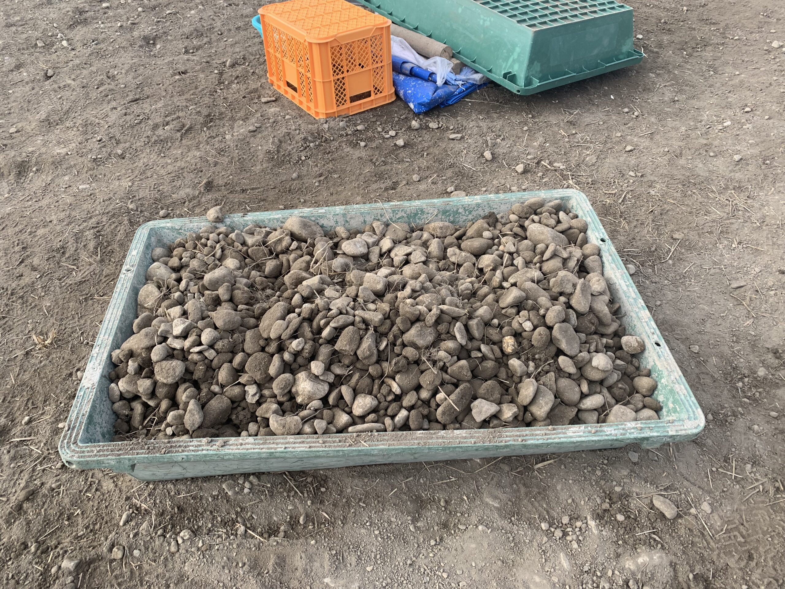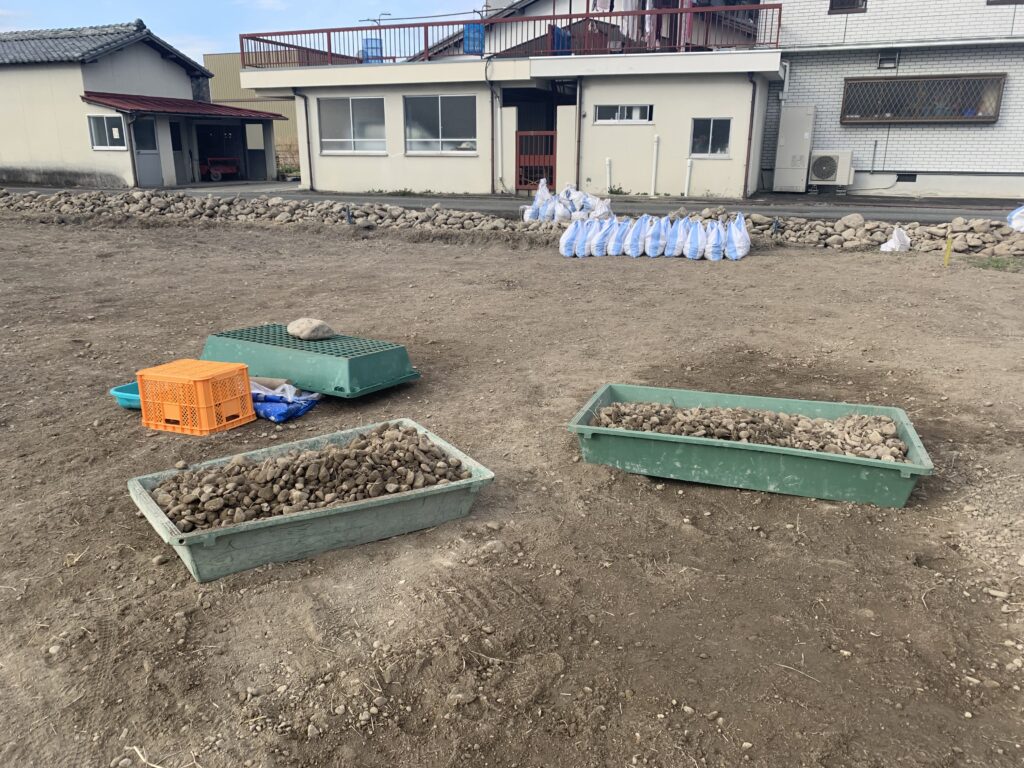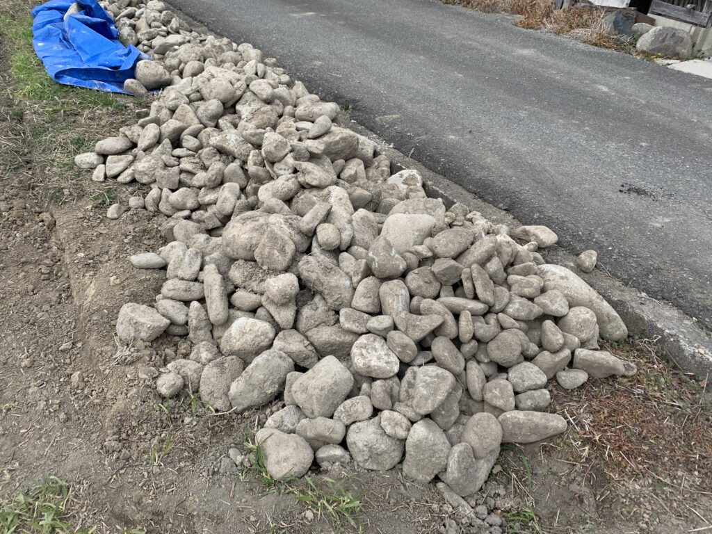 地下1.5mくらいまで掘って暗渠排水を整備したのは良いですが、その代償として大量の石を掘り出してしまいます。